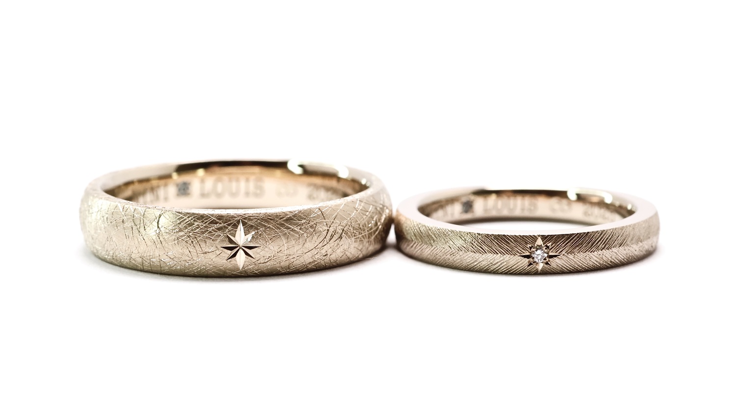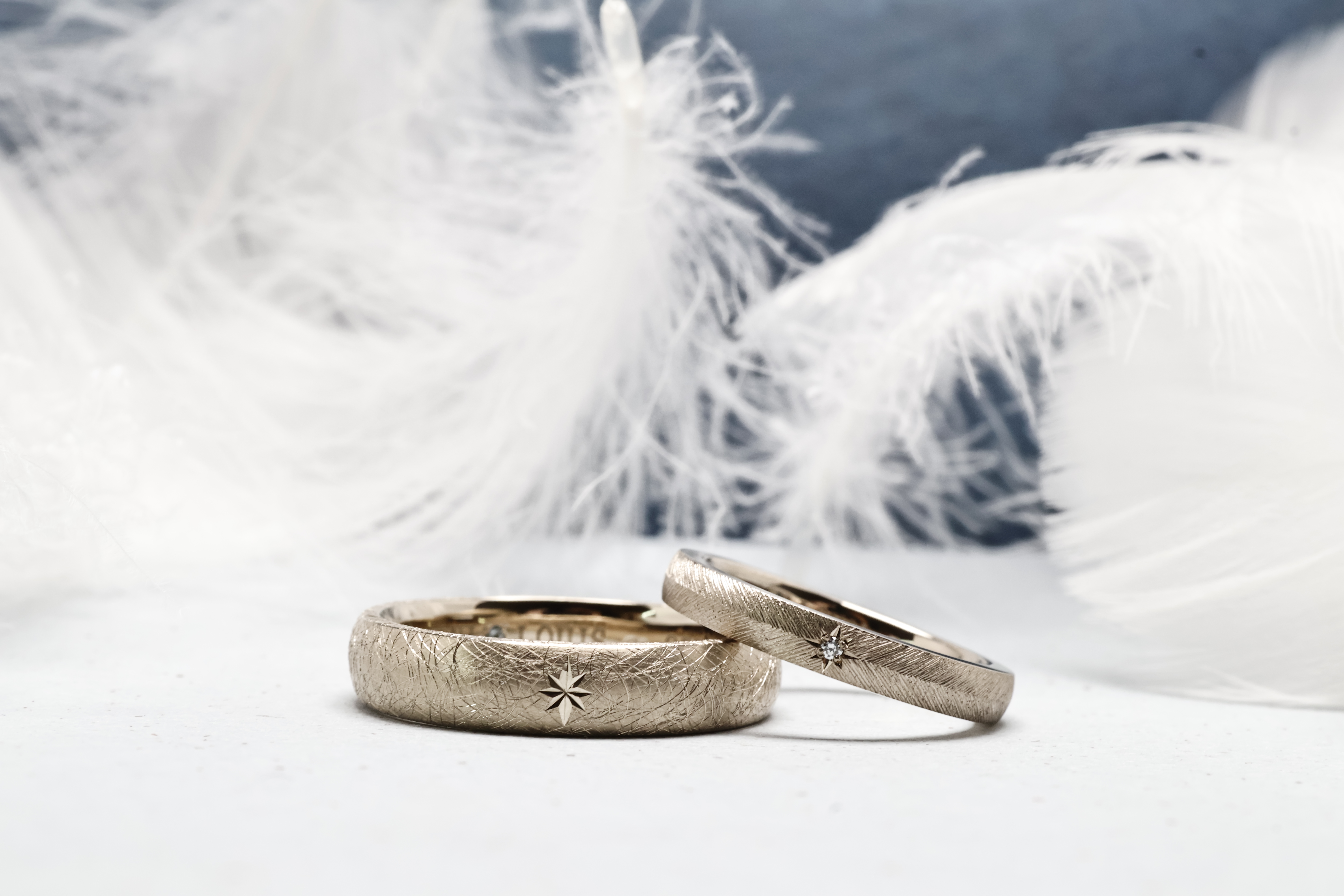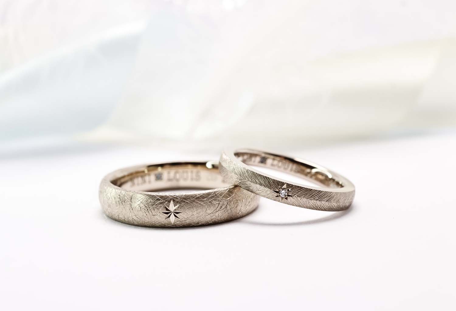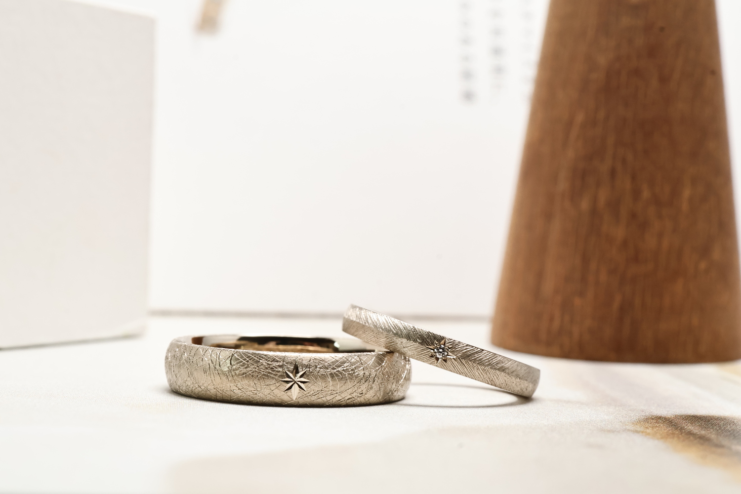 在一番苦惱過後,兩人最後選擇了雕刻的設計,精細的作工和獨特的光澤,讓戒指映襯出兩人不一樣的個性。