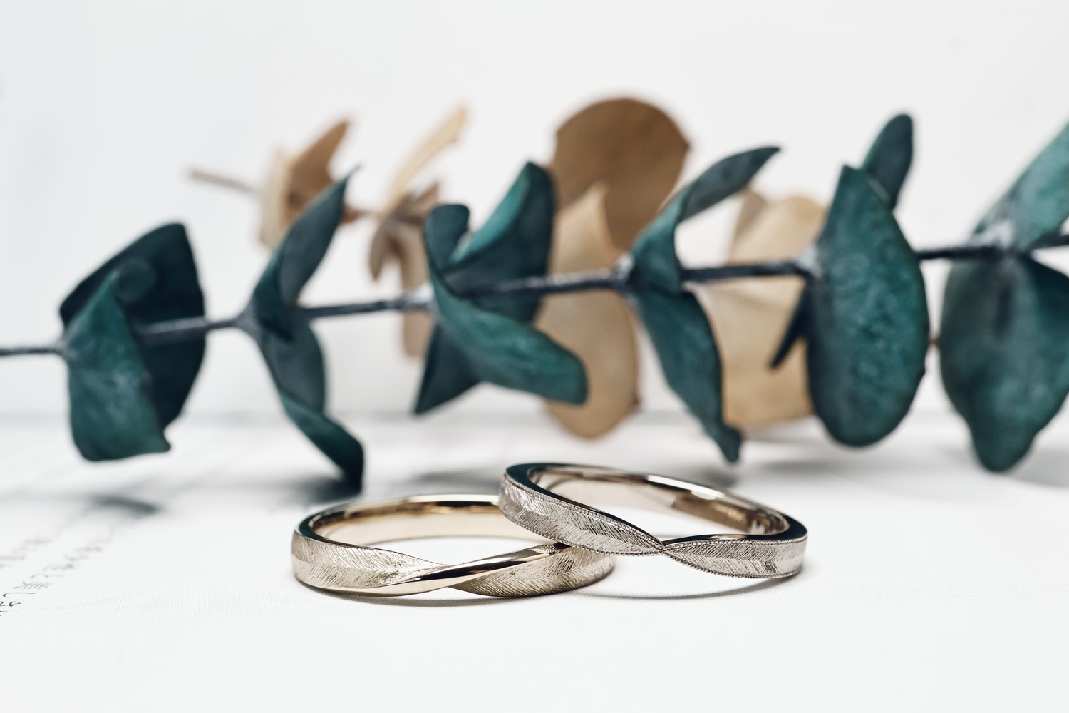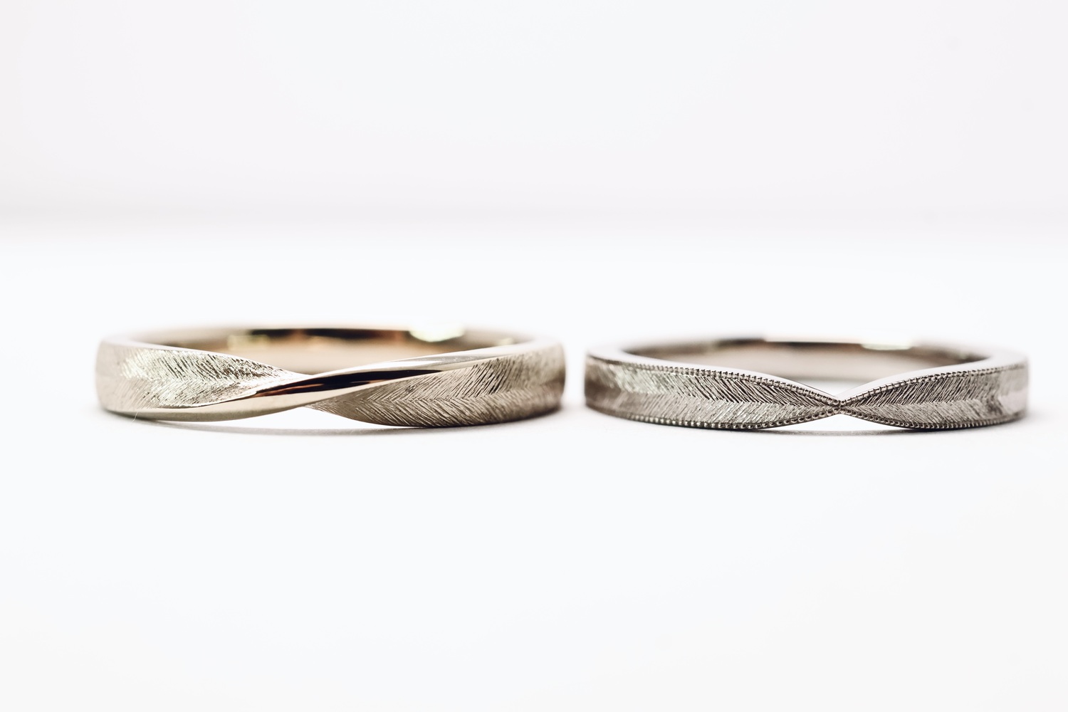 女生則選擇Ribbon uno搭配Piuma紋理,柔和的線條感加上細緻的滾珠細節,再搭配微霧亮的質感,讓戒指更顯溫柔且富有個人特色。