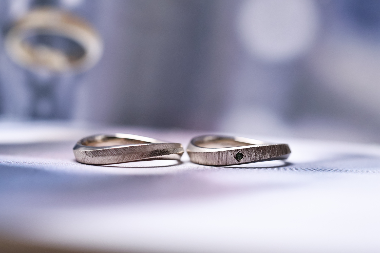女生喜歡曲線形狀,希望戒指能修飾手指。最後選擇了 Vivace,帶有 S 行線條的戒型。整體以霧面質感為主,其中一面加入 Pioggia 雕刻紋理,像是下雨時落下的直線痕跡,霧面中帶著一點復古光澤。