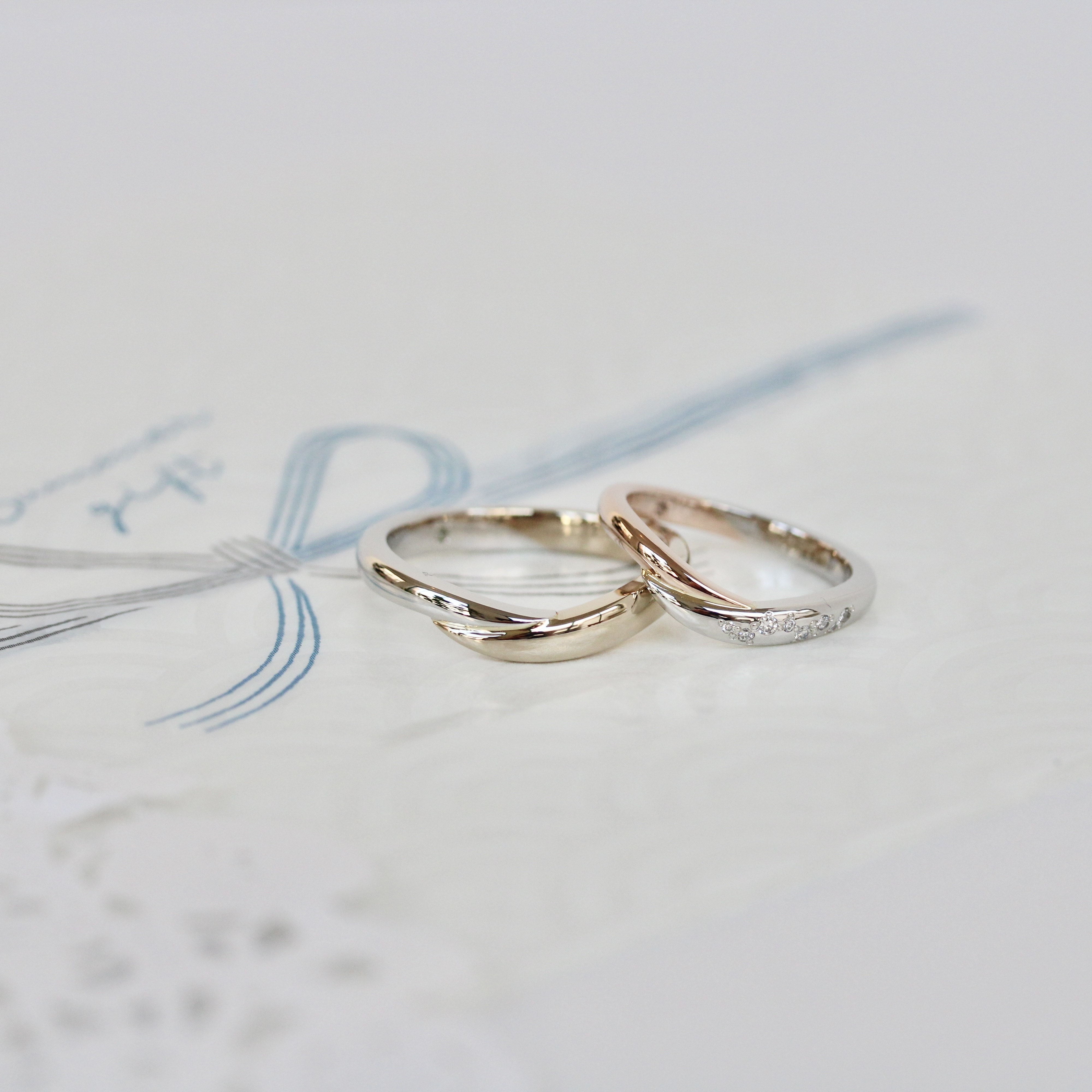 試戴了從裝飾簡約的基本款到飾有華麗紋樣的款式等多種設計後,兩人共同喜好的重點是採用兩種金屬材質的「色彩組合」設計。