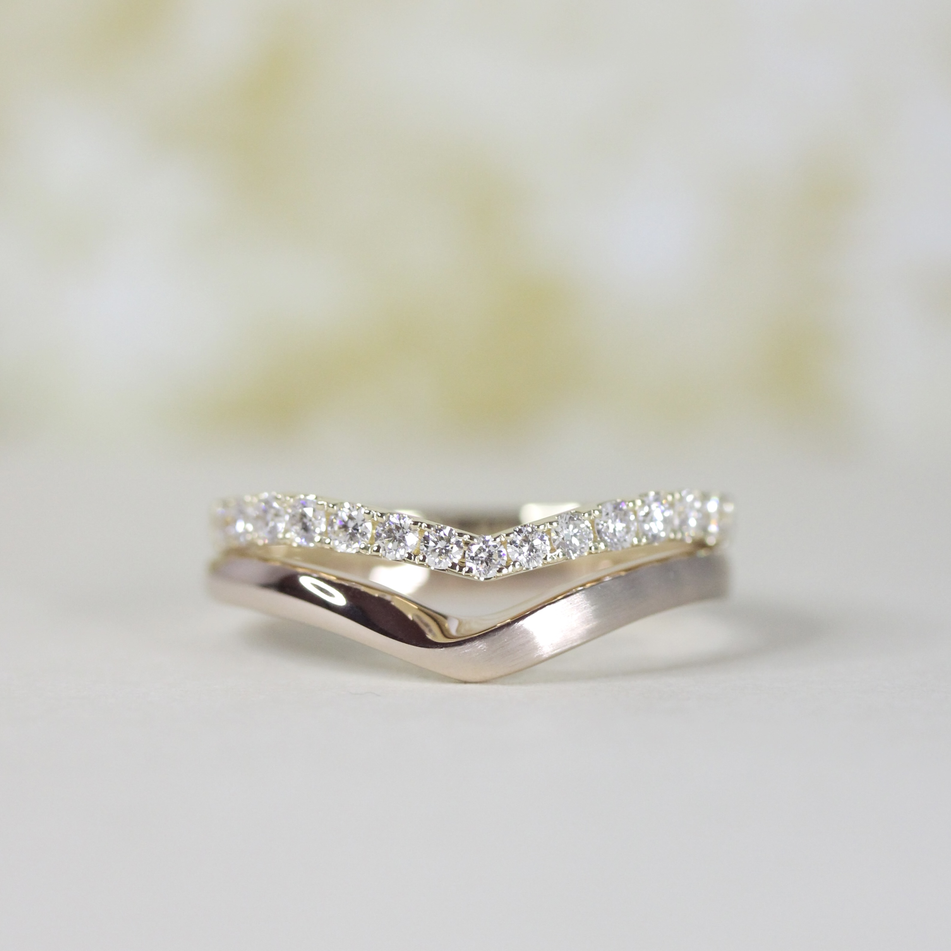 女生選的《Hanamizuki》是淺V字,上面鑲有15顆鑽石的半圈鑲嵌設計。